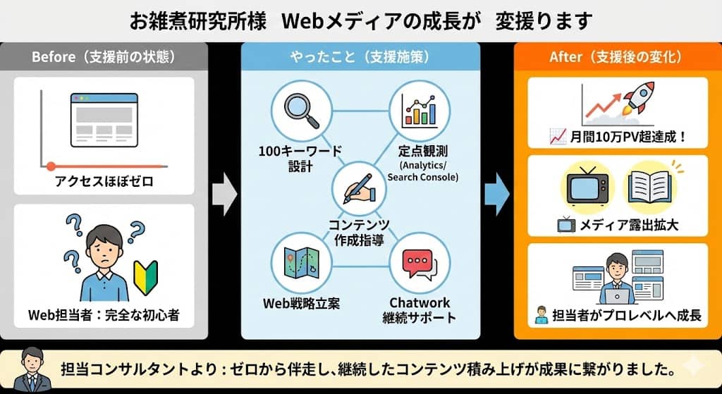 After 月間 1万PV に成長。契約終了後も自走で 2万PV超 を達成